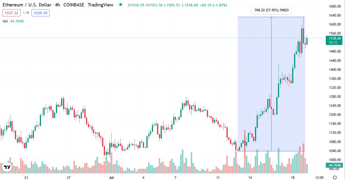 Зростання ціни ETH можна пояснити постійним переходом у механізмі консенсусу. Останнє оновлення Ethereum викликало інтерес інвесторів і оголошення про те, що Ethereum перейде до більш енергоефективного механізму підтвердження частки, можливо, сприяло ралі.